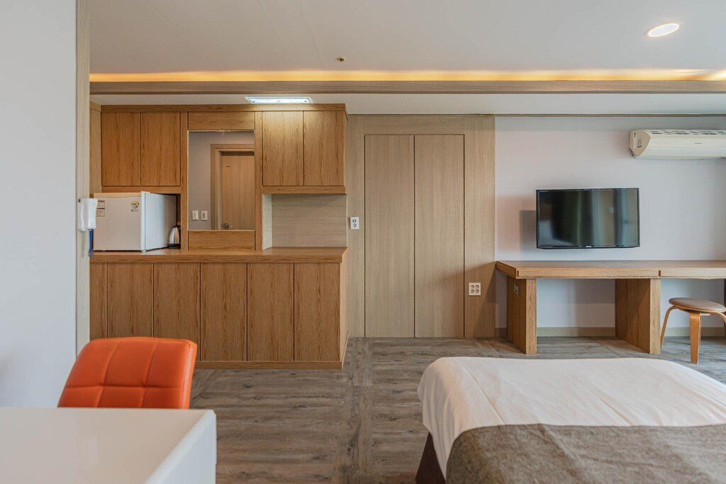 디럭스룸은 약 17평 규모의 원룸형 객실로, 트윈베드가 마련되어 있다. 취사가 가능한 주방에는 냉장고, 인덕션, 전기밥솥, 커피포트, 조리도구 등이 구비되어 있어 간단한 식사를 준비하기에 편리하며, 전자레인지는 공용으로 이용할 수 있다.