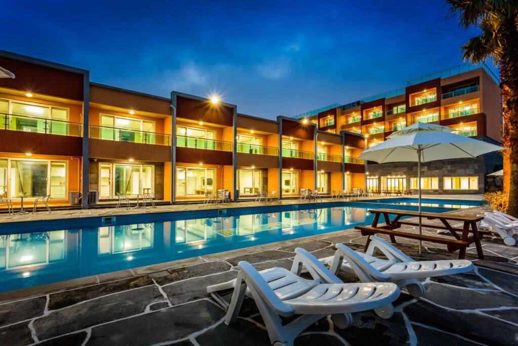 야외 미온수 수영장을 여유롭게 즐기고 싶은 여행자