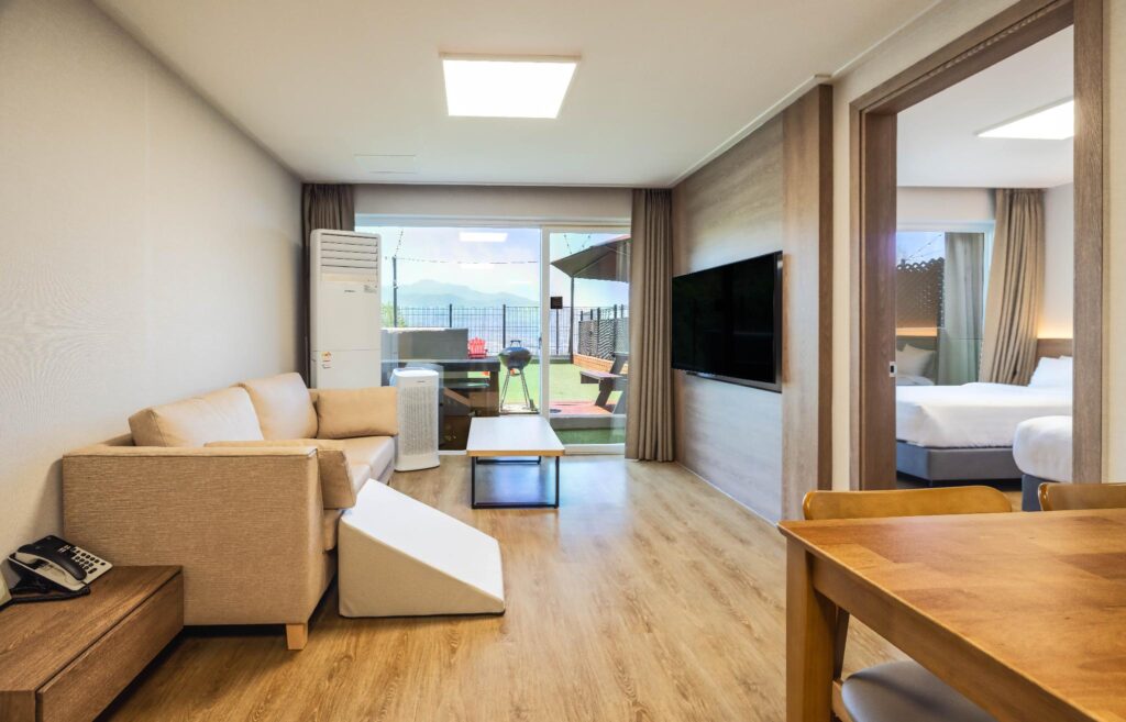 애견 동반 전용 객실은 이 외에도 여러 유형이 마련되어 있다. 로열스위트펫이나 프라이빗 프리미어펫처럼 넓은 구성을 갖춘 객실도 있어 취향이나 인원에 따라 선택의 폭이 넓다. 특히 프라이빗 로열스위트펫은 개별 운동장이 갖춰져 있어 반려견이 마음껏 움직일 수 있고 가족 단위로 바비큐를 즐기기에도 좋다. 최대 성인 9인까지 이용할 수 있어 여러 세대가 함께 떠나는 여행에도 충분하다.