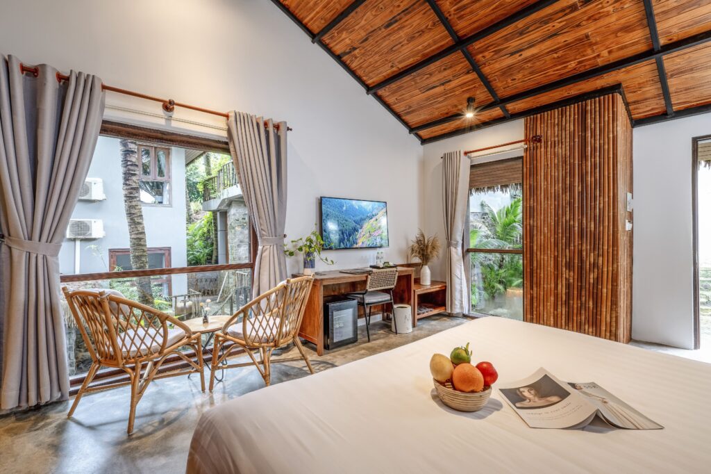 푸꾸옥 엠빌리지는 자연 속에 머무는 듯한 감성적인 분위기의 리조트이다. 중앙에 자리한 에코풀을 중심으로 36개의 객실이 배치되어 있으며, 언제든지 나와 수영을 즐길 수 있다. 공용 수영장을 이용하지만 합리적인 가격대 덕분에 만족도가 높고, 아름다운 조경과 감성적인 인테리어 덕분에 사진 명소로도 손꼽힌다.