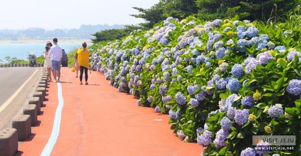 첫 번째로 소개할 제주 수국 명소는 ‘종달리 수국길’입니다. 종달리 해안 도로를 따라 풍성히 피어난 수국을 감상할 수 있어요. 보통 6월 중순쯤 만개해 가장 아름다운 풍경을 자랑해요. 도로 바로 옆이라 차가 많으니 주변 차를 조심하며 구경하세요.