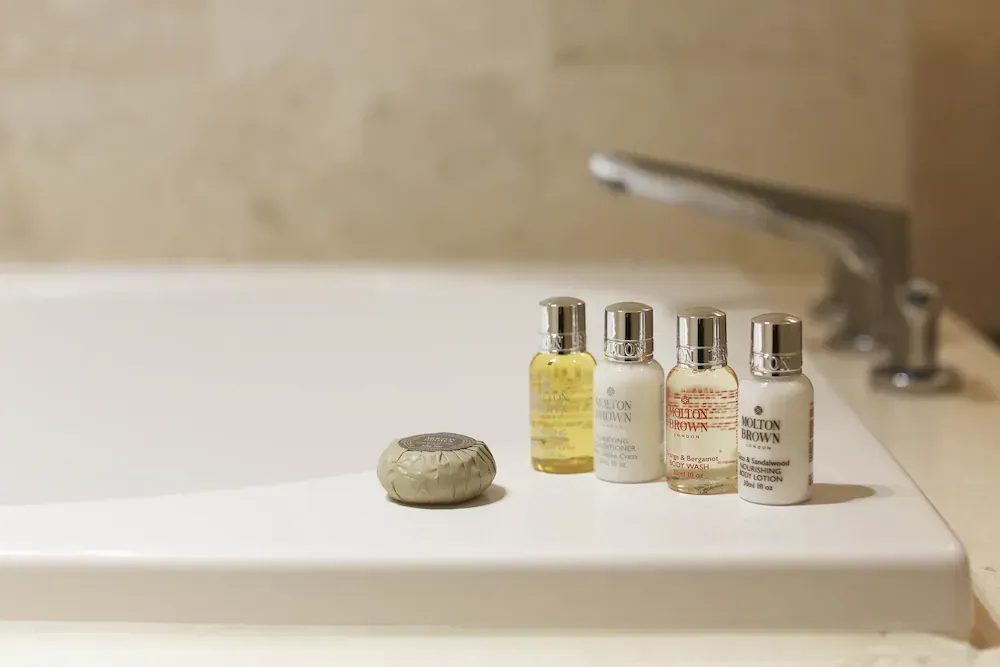 옷장 안에 샤워가운, 슬리퍼, 금고가 있고 테이블 위에 전기포트와 컵, 커피와 티가 준비되어 있어요. 냉장고에는 예약한 수만큼 생수가 구비되어 있답니다. 화장실 역시 깔끔해요. 샴푸, 컨디셔너, 보디워시, 수건 등 기본 어메니티도 제공되니 개인 세면도구와 칫솔, 치약 등만 챙기시면 돼요.